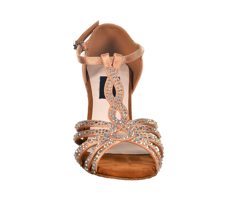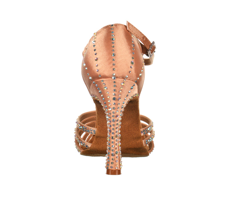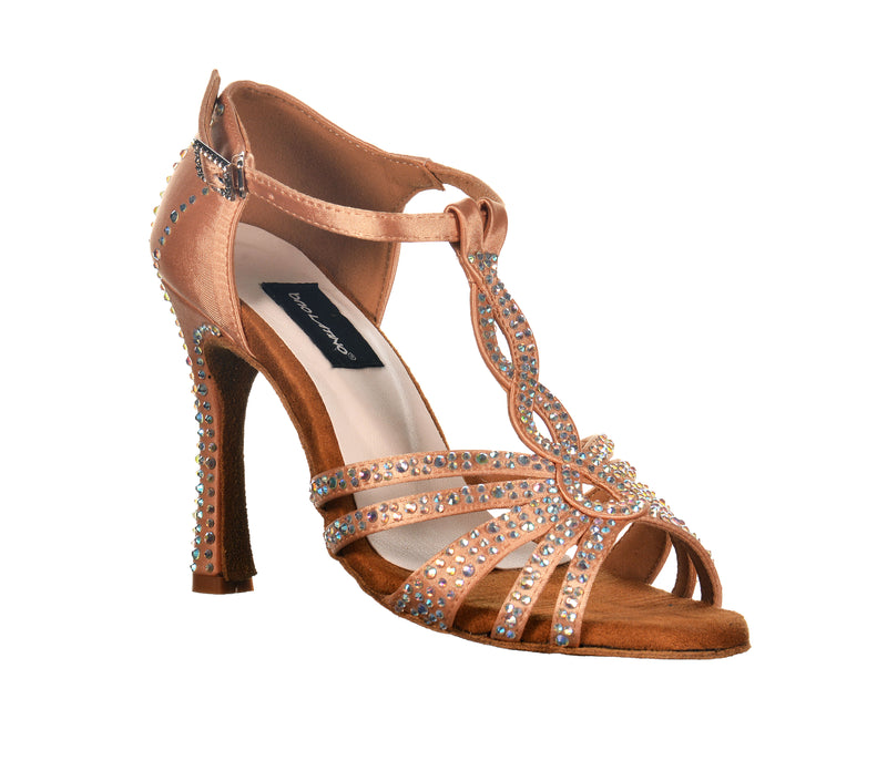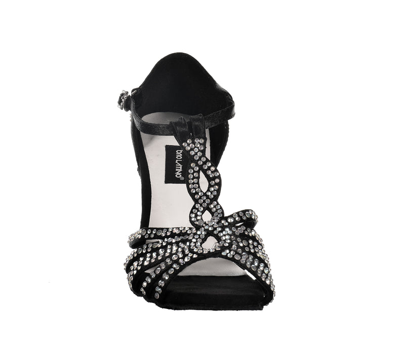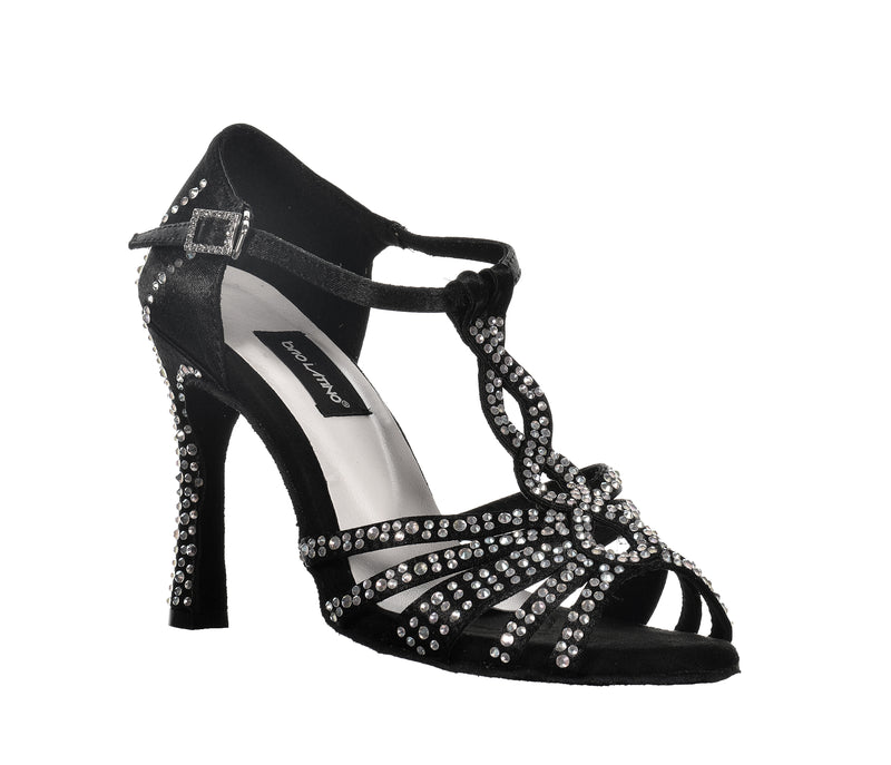 Un nuovo ed elegante disegno a 5 fasce con incrocio verticale, in grado di avvolgere ed aumentare la stabilità su tacchi slanciati. Realizzata con tomaia in raso e decorata con eleganti linee di crystal strass. Chiusura regolabile alla caviglia e fibbia abbinata. Tacco alto da 10 cm in grado di slanciare la gamba senza ridurre il comfort grazie alla morbida suola scamosciata e alla speciale Intersuola Brio Latino che attutisce i colpi.